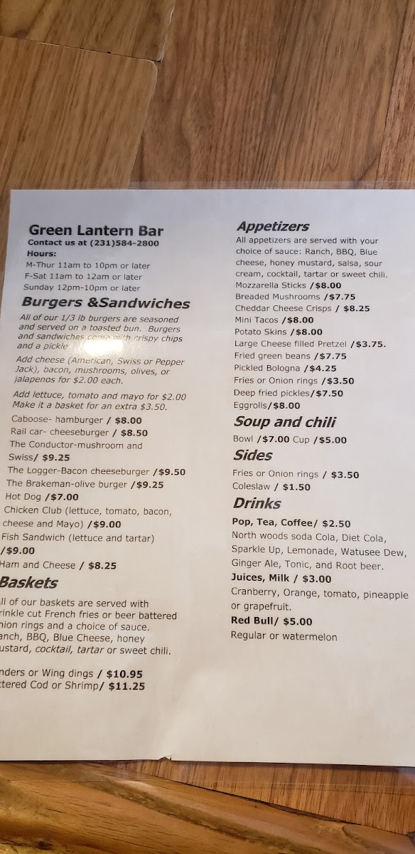 Welcome to Green-Lantern Bar, a hidden gem located at 3958 US-131, Alba, MI. This cozy bar and grill is the perfect pit stop for food lovers and adventurers alike. With a limited yet delightful menu, diners can indulge in savory burgers like the Rail Car Cheeseburger and The Logger, or tantalizing appetizers such as Pickled Bologna and Fried Green Beans.